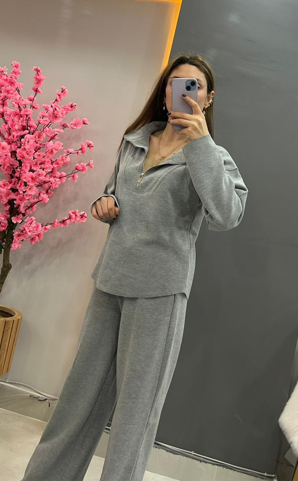 Gri polo yaka eşofman takımı, rahat bir stil sunarak şıklığınızı rahatça tamamlar.